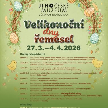 27. 3. – 4. 4. 2026 Historická budova Jihočeského muzea v Českých Budějovicích (Dukelská 1, 370 01 České Budějovice) Přijďte si užít Velikonoce do Jihočeského muzea. Od 27. března do 4. dubna se můžete těšit na ukázky řemesel v podání významných […]