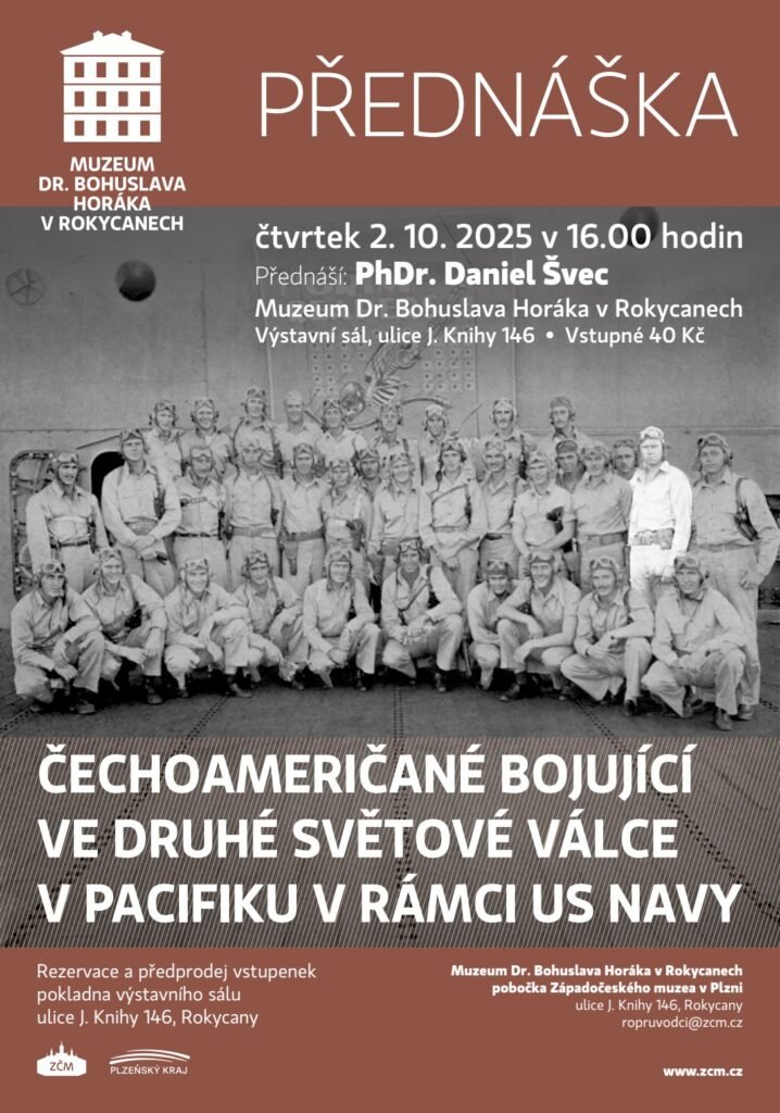 Srdečně Vás zveme do Muzea Dr. Bohuslava Horáka v Rokycanech, pobočky Západočeského muzea v Plzni, na přednášku nazvanou „Čechoameričané bojující ve druhé světové válce v Pacifiku v rámci US NAVY“, která se uskuteční ve čtvrtek 2. 10. 2025 v 16.00 hodin ve výstavním sále , ulice J. Knihy 146, Rokycany. Přednáškou Vás provede PhDr. Daniel Švec.